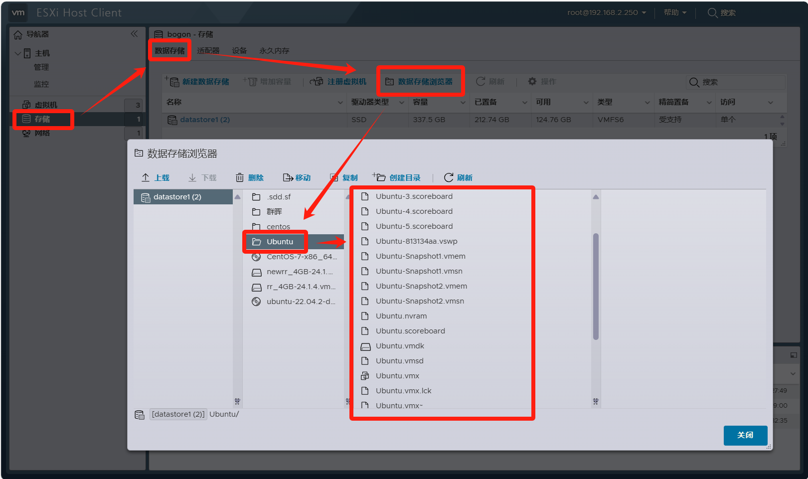 在ESXI内点击存储--数据存储--数据存储浏览器--虚拟机文件夹