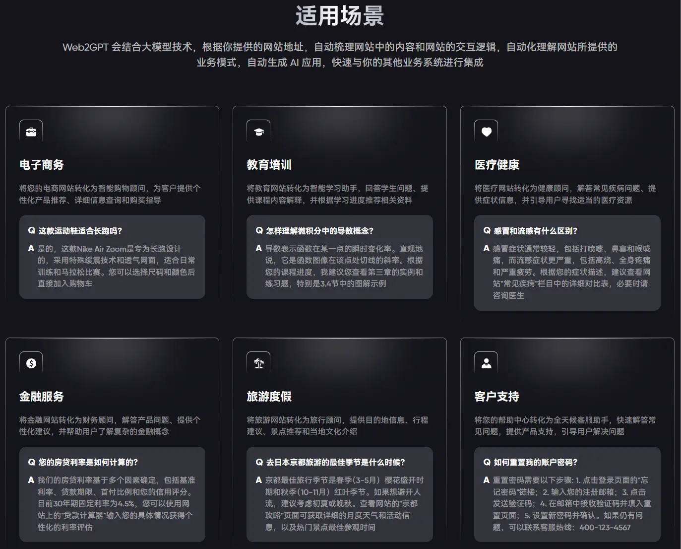 名称的含义:Web2GPT(读作 Web to GPT),顾名思义,它可以基于一个 Web 网站中的业务内容,自动生成类似 ChatGPT 的 AI 应用。