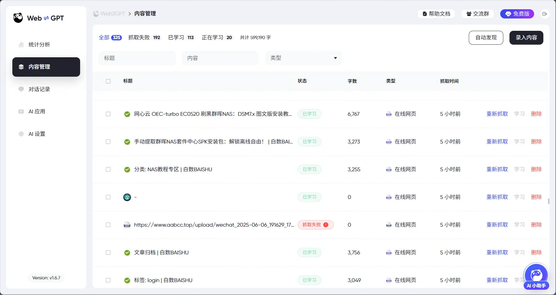 添加完成之后会自动开始抓取全站内容,等待全部抓取之后你可以全选,点击学习。