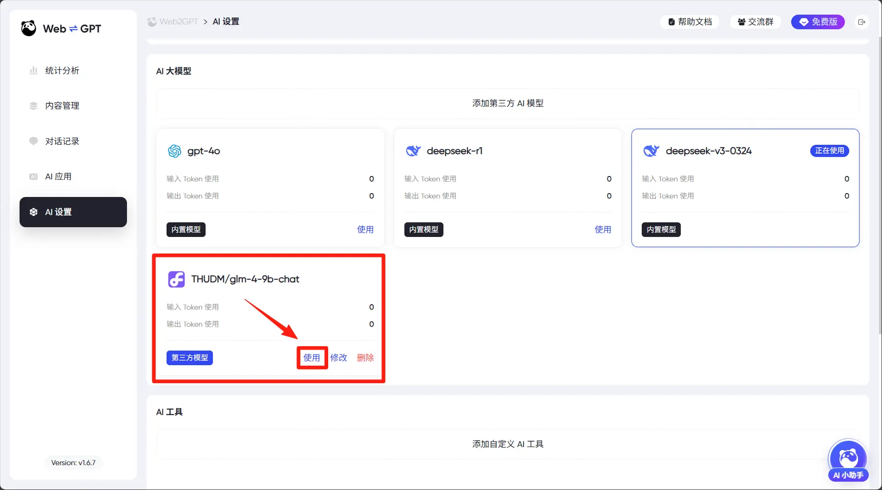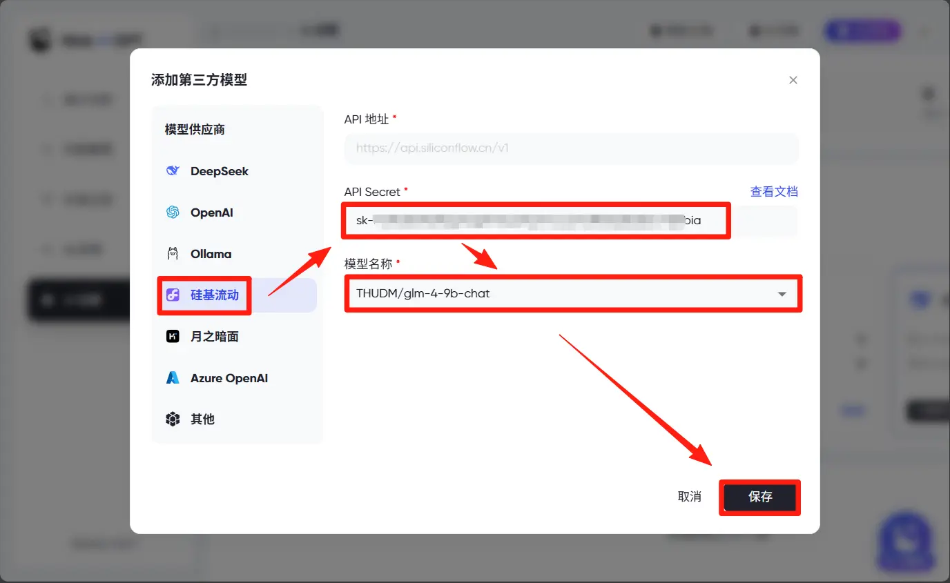 选择硅基流动,粘贴我们的API密钥,选择你想使用的AI模型,然后点保存。